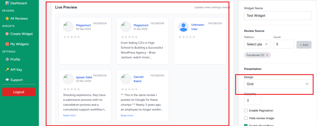 4. You can also check the ‘Live Preview’ on the side, which makes it easy to choose the design that best showcases your reviews on your website.