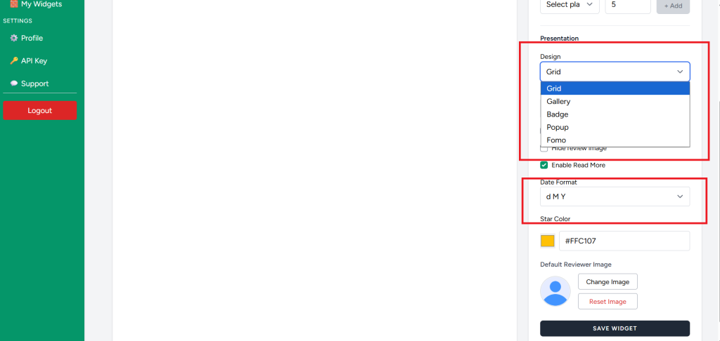 3. You can also choose a design for your reviews. Multiple options are available, such as Grid, Fomo, and more, which provide a perfect representation of reviews on your website.