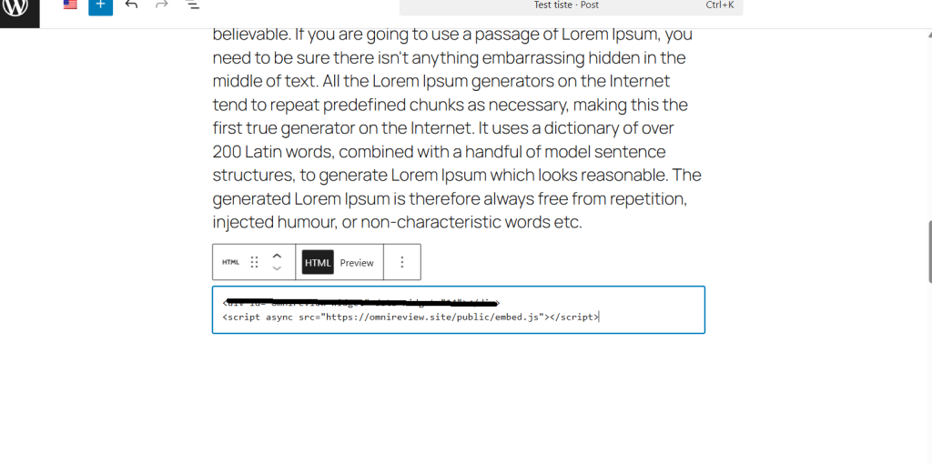 8. Once copied, go to your website’s HTML code and paste it there. In the example below, we are using a WordPress website where the code is pasted into an HTML block. However, this copied code works on any website and with any builder.