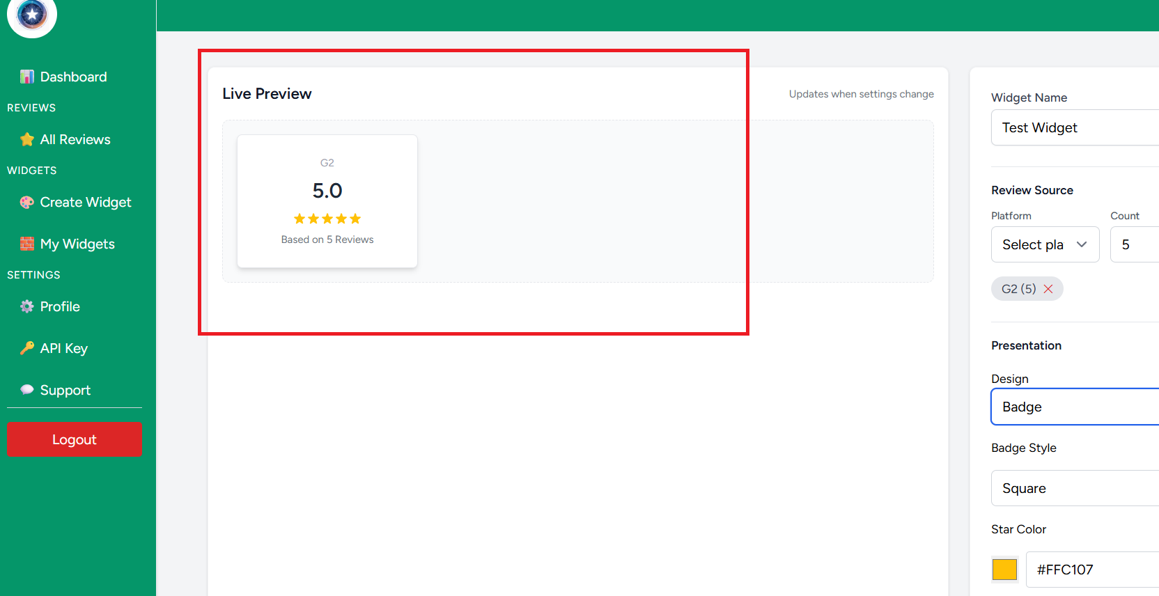 5. You can also check the ‘Live Preview’ on the side, which makes it easy to choose the design that best showcases your reviews on your website.