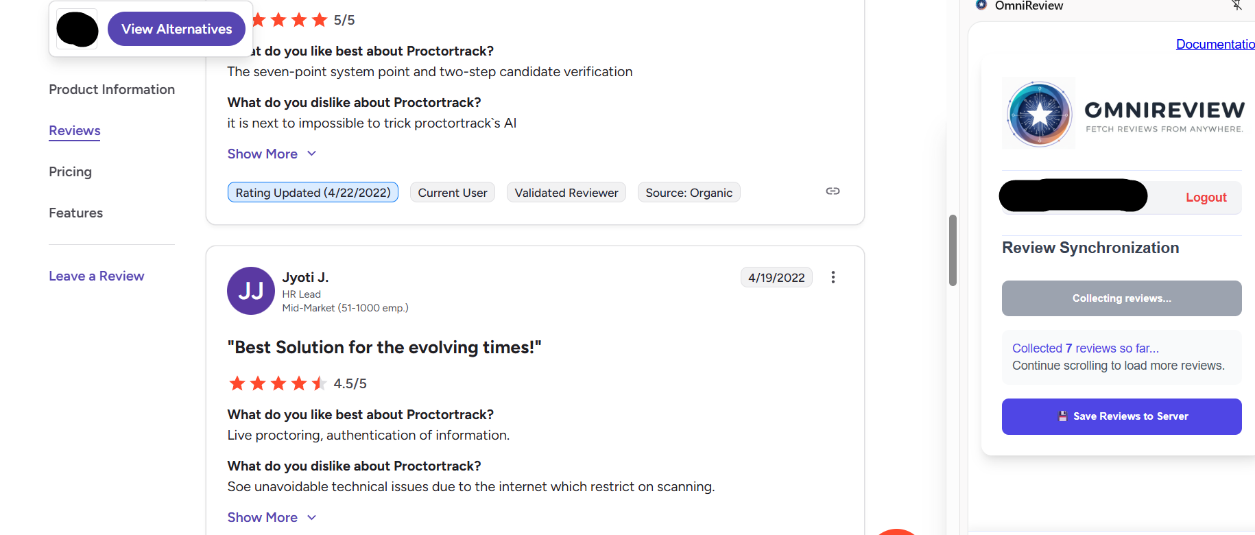 2.Copy the token, then click on the Omnireview extension installed in your browser. Go to your G2 Platform, Search for the organization, navigate to the Reviews section where your client feedback is listed, and click on “Start Collecting Reviews” to begin fetching the reviews.