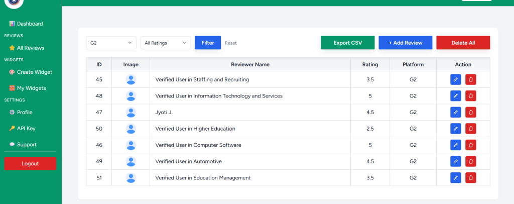 4. On the dashboard, click on “All Reviews” to view the collection of reviews gathered from G2 Platform Reviews using the Omnireview tool.